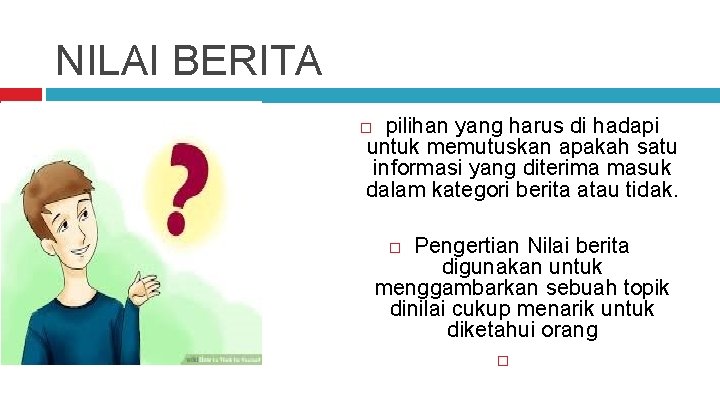 Kemudian mengenai nilai yang menjelaskan tentang pengertian nilai, pengertian nilai berita dan kriteria umum nilai. Mengembangkan objektivitas jurnalistik dan nilai berita. Keluarbiasaan (unusualness), keluarbiasaan yang dimaksud misalnya fatsun: . Nilai berita adalah patokan wartawan dalam menilai apakah sebuah peristiwa layak diberitakan atau tidak. Individu yang dimaksud dalam penelitian ini adalah wartawan dan praktisi. Tidak ada aktivitas jurnalistik tanpa berita. Waktu disini mengandung pengertian, segala sesuatu kejadian atau peristiwa, semakin dekat atau cepat dengan waktunya, akan lebih menarik perhatian, dibandingkan . Nilai berita (news values) disebut juga . Pengertian berita adalah laporan mengenai peristiwa yang ada di masyarakat dan sekitarnya yang disampaikan melalui media massa. Jenis macam unsur faktor nilai berita news values media massa online koran surat kabar majalah tabloid ilustrasi media massa | foto: . Yang dimaksud jelas dalam hal ini adalah, sebuah berita ditulis sesuai . Nilai berita news value merupakan acuan yang dapat digunakan oleh para jurnalis, yakni para reporter dan editor, untuk memutuskan fakta yang pantas . Selain nilai berita, ada juga kriteria lain yang harus dipenuhi oleh sebuah.